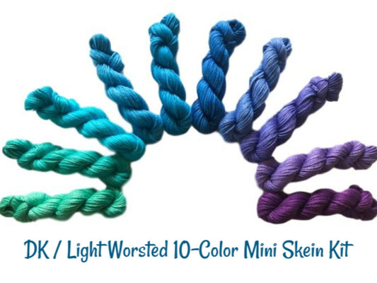 Vegan Yarn Mini Skein Kit - Hand Dyed DK / Light Worsted Bamboo Cotton - (10) 53 yd Skeins in Bright Semi Solids - 3 Ply Ultra Soft Yarn