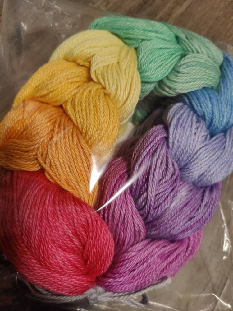 Please note, the total yardage for this kit is 530 yds (53 yds per skein). This is *not* enough yarn for a traditional baby blanket in most cases. However, ordering 2 kits would provide enough for most small baby blanket patterns and I always ensure matching dye lots for people who do this. If you need more or less of a specific color, or need to add on a neutral such as silver/gray for a larger project, please message me so I can assist you further. :)